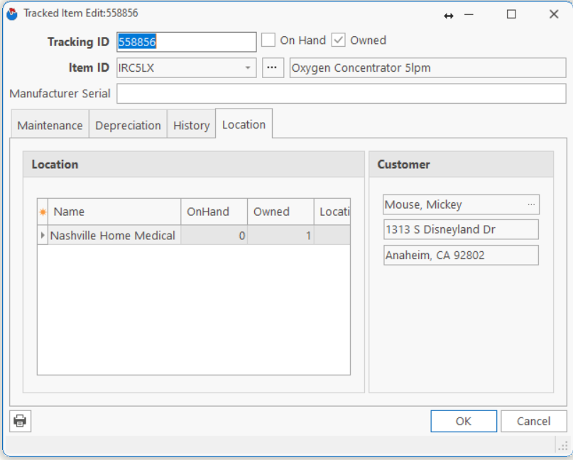 This tab displays the current Location of the Tracked Item, and the current customer (if available) who has the Item.