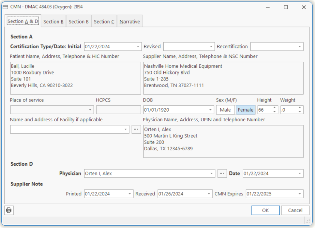 | In Section A, at least the patient’s name, address, telephone and HIC number, the supplier’s name, address, telephone and NSC number, and the HCPCS codes must be completed by the supplier before the CMN is sent to the physician. The codes which require a CMN/DIF are listed later in this section. These are the codes that should be listed in Section A of the CMN/DIF. Section A of these CMN’s may be completed by the supplier. It is important for the supplier to accurately complete all items in Section A, especially the beneficiary’s name, address and MC number. Include complete supplier information, including the NSC assigned supplier number. Prior Authorizations cannot be completed without this information. The supplier must also include the HCPCS code, complete narrative description, brand name and model number, and all applicable modifiers in the HCPCS Code(s) section. This would include the RR modifier if the equipment were to be rented, and the NU or UE modifier to signify purchase of new or used equipment. |