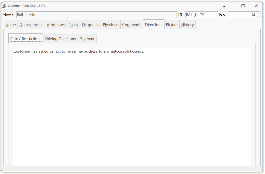 | Care/ Restrictions | If the patient requires additional/special care or restrictions, then that information will be placed here.