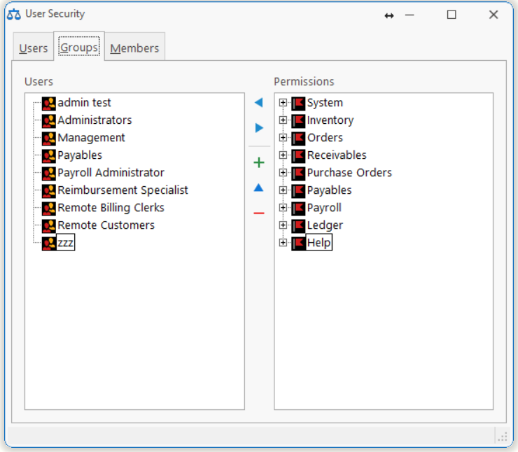 This is where you would add new Permission Groups authorized to use the system and identify what permission each Group has within the program. You’ll notice Groups in the left pane and Permissions in the right pane