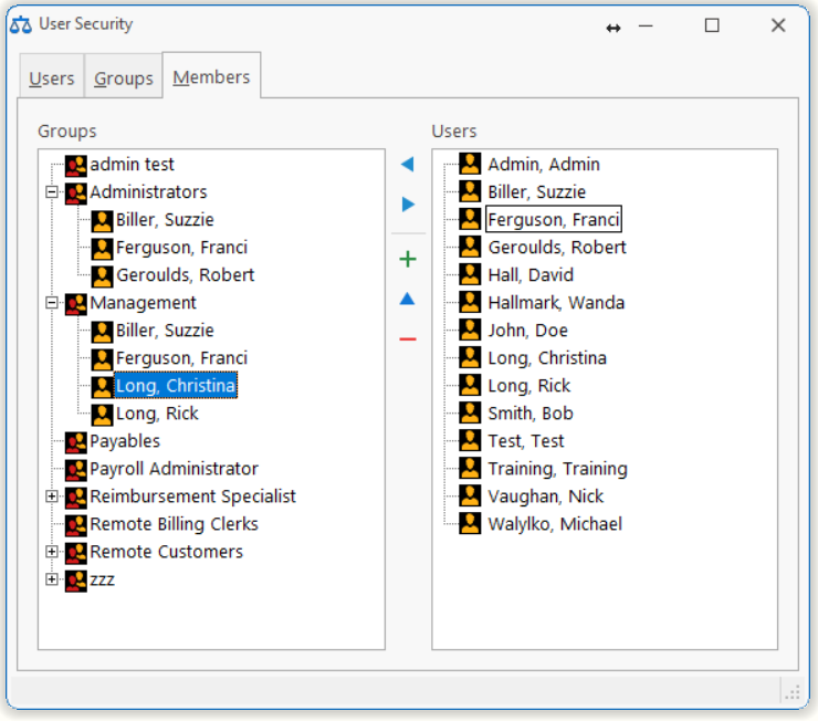 Note: A user can be a member of multiple groups. For example, Christina Long could be a member of the billing clerks group and payroll administrator group which would give her the rights from both groups.