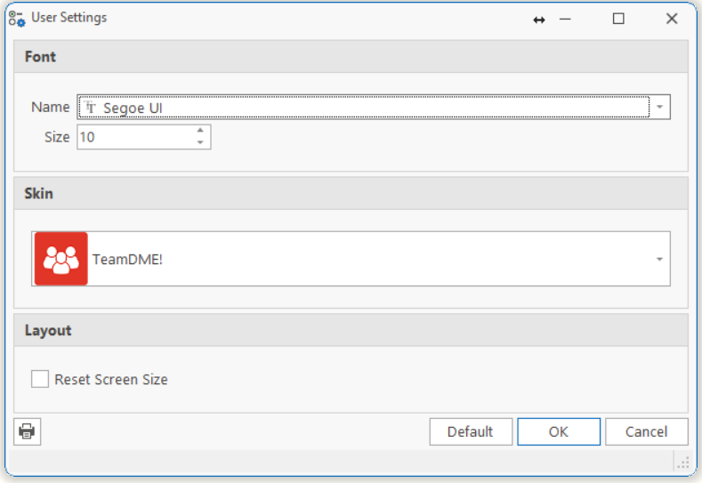| Layout | If you want to Reset Screen Size of TeamDME Inc, then check this box. Hit OK to save and exit TeamDme Inc. |